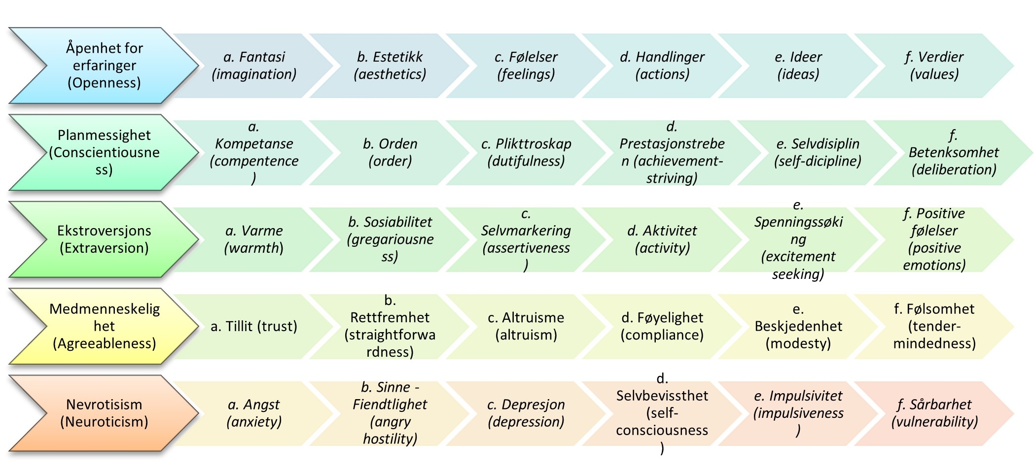 Femfaktormodellen for personlighetstrekk antar at individers personlighet kan forstås og beskrives ved hjelp av disse fem overordnete dimensjoner som 30 underliggende trekk ordnes inn under: